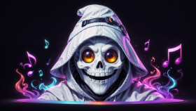 Skeleton dj in neon music galaxy