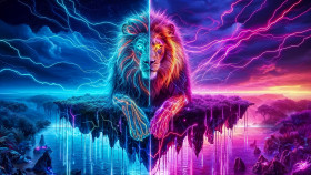 Two lions with neon fur, one blue and one pink, stand on rock formations floating on a body of water