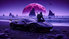 A warrior wearing a hooded cloak sits on the hood of a black sports car on the beach with a vibrant purple moon in the background