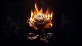 A pure white rose stands in the middle of darkness, slowly engulfed by gentle flames. The petals shimmer with soft golden light as the fire dances across them, turning pain into beauty. It feels timeless — a symbol of passion, loss, and quiet strength beneath the stars