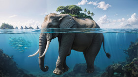 A majestic elephant swimming in the ocean with a small island on its back and tropical trees in the background