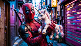 A red masked superhero is standing in a narrow neon lit city street while holding a small white unicorn in both hands. The superhero is wearing a tight red and black suit with protective pads and gloves. The unicorn has a single horn on its forehead and a light colored mane and tail