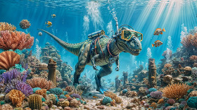 A dinosaur equipped with modern diving equipment explores an ancient underwater world surrounded by colorful coral reefs and marine life