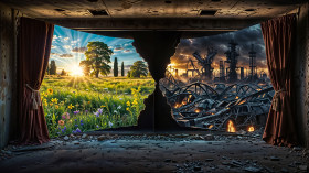 There is a stage with large curtains divided into two, one part of which shows a beautiful view and the other part shows a ruined view.