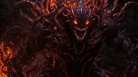 A menacing, red-skinned symbiote with bared teeth and a huge mouth stands powerfully in the middle of a fiery inferno