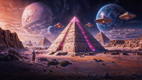 A person stands in front of an ancient Egyptian pyramid surrounded by a pink-lit desert landscape